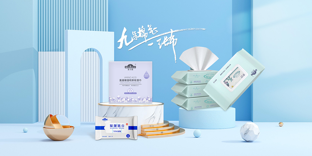 廠區占地8000平,擁有2個GMP十萬級無塵車間、EDI七級純水過濾系統和臭氧殺菌系統,配備50余條全自動濕巾、棉柔巾、柔巾卷等系列生產線,日產能可高達100萬包。